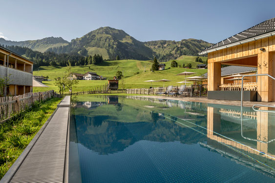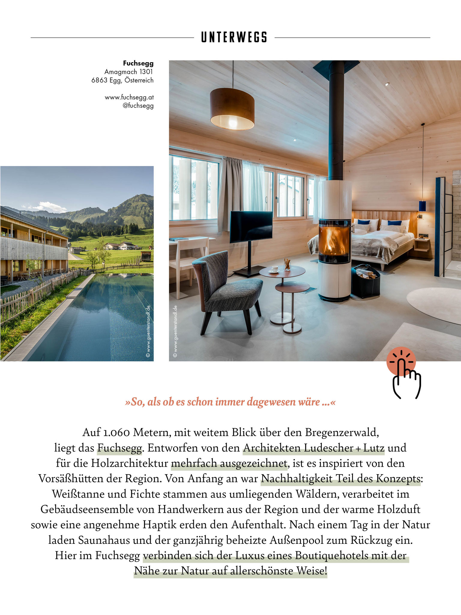 Auf 1.060 Metern, mit weitem Blick über den Bregenzerwald, liegt das Fuchsegg. Entworfen von den Architekten Ludescher + Lutz und für die Holzarchitektur mehrfach ausgezeichnet, ist es inspiriert von den Vorsäßhütten der Region. Von Anfang an war Nachhaltigkeit Teil des Konzepts: Weißtanne und Fichte stammen aus umliegenden Wäldern, verarbeitet im Gebäudseensemble von Handwerkern aus der Region und der warme Holzduft sowie eine angenehme Haptik erden den Aufenthalt. Nach einem Tag in der Natur laden Saunahaus und der ganzjährig beheizte Außenpool zum Rückzug ein. Hier im Fuchsegg verbinden sich für uns der Luxus eines Boutiquehotels mit der Nähe zur Natur auf allerschönste Weise – so, als ob es schon immer dagewesen wäre …